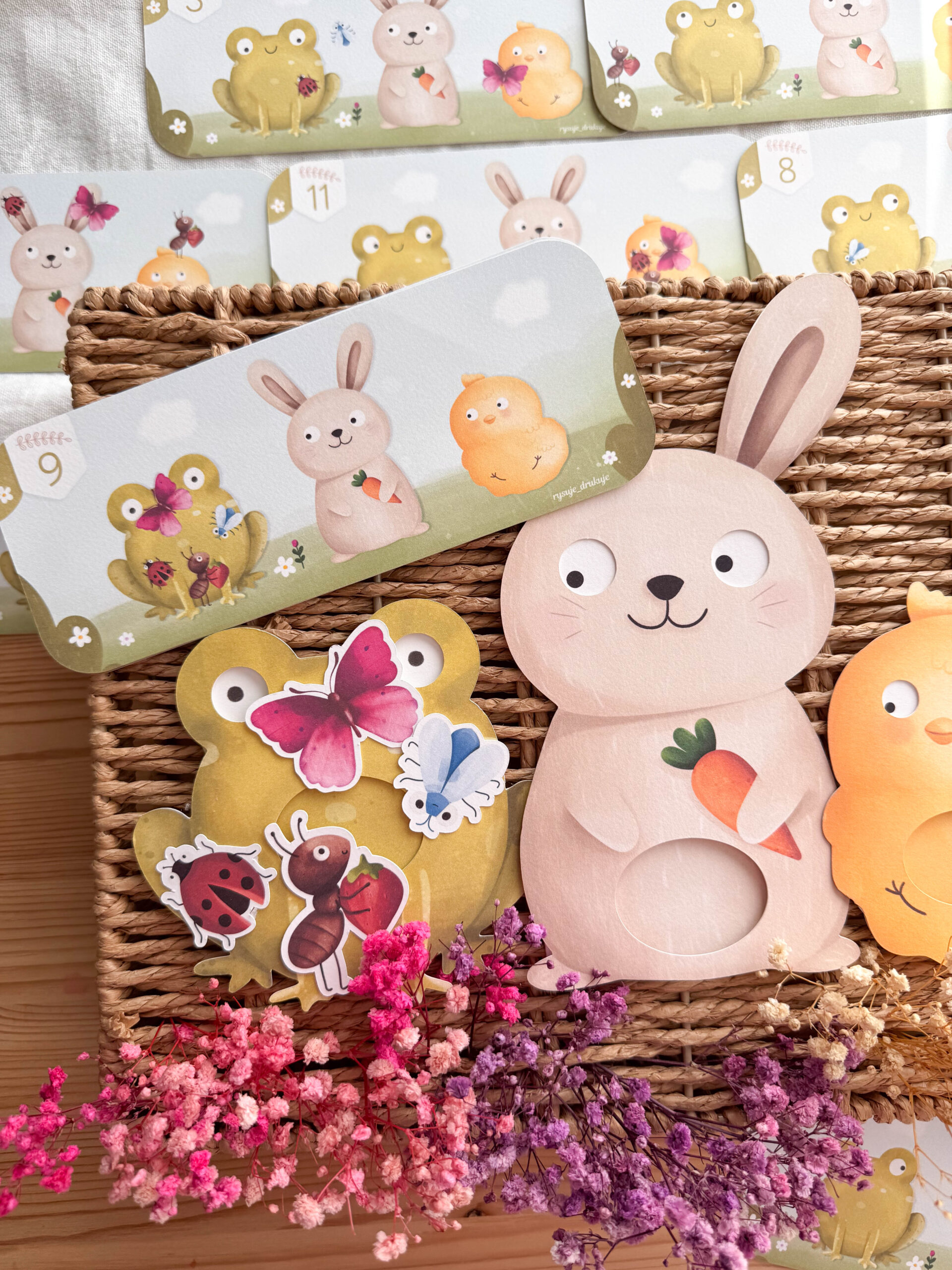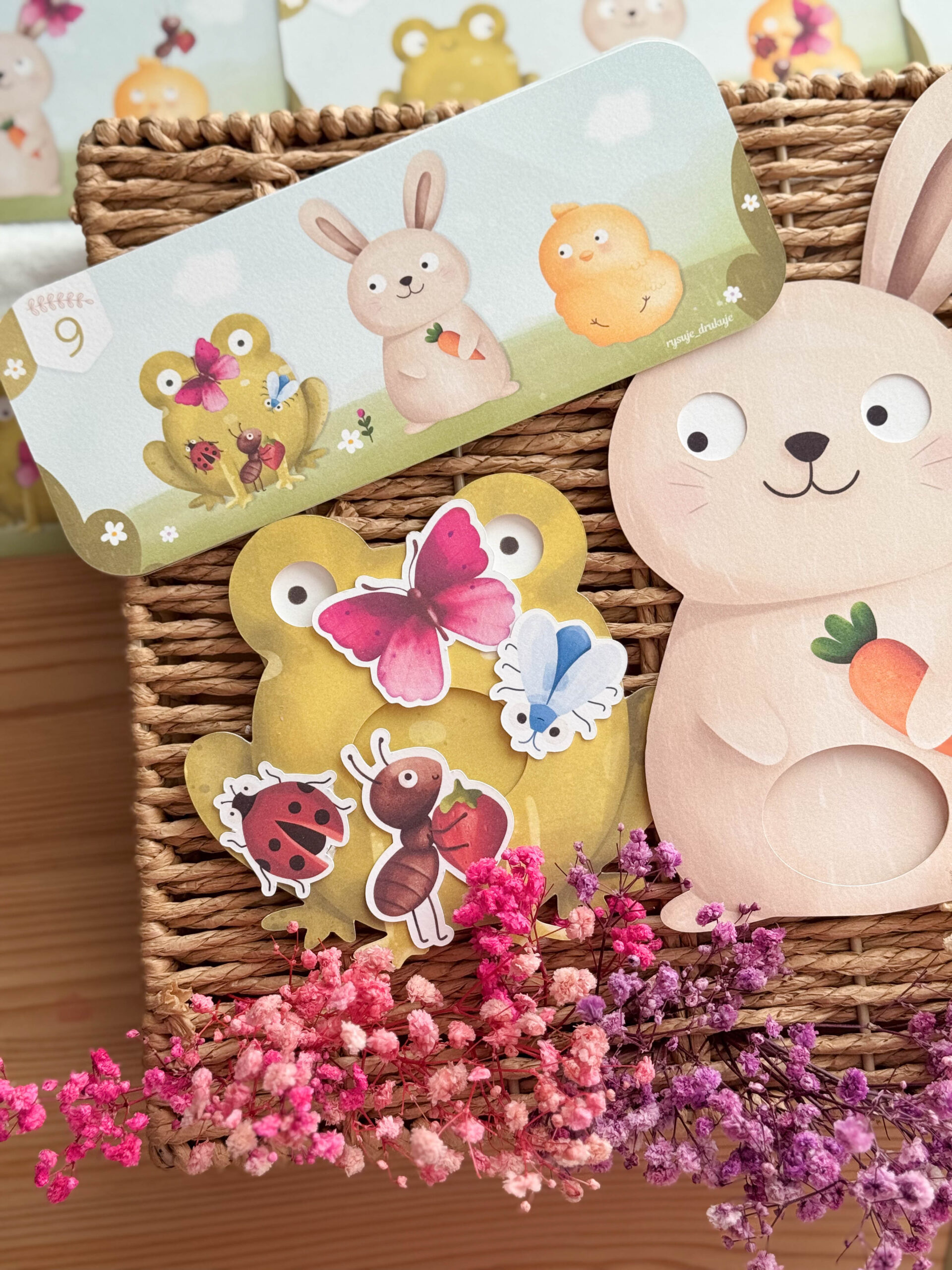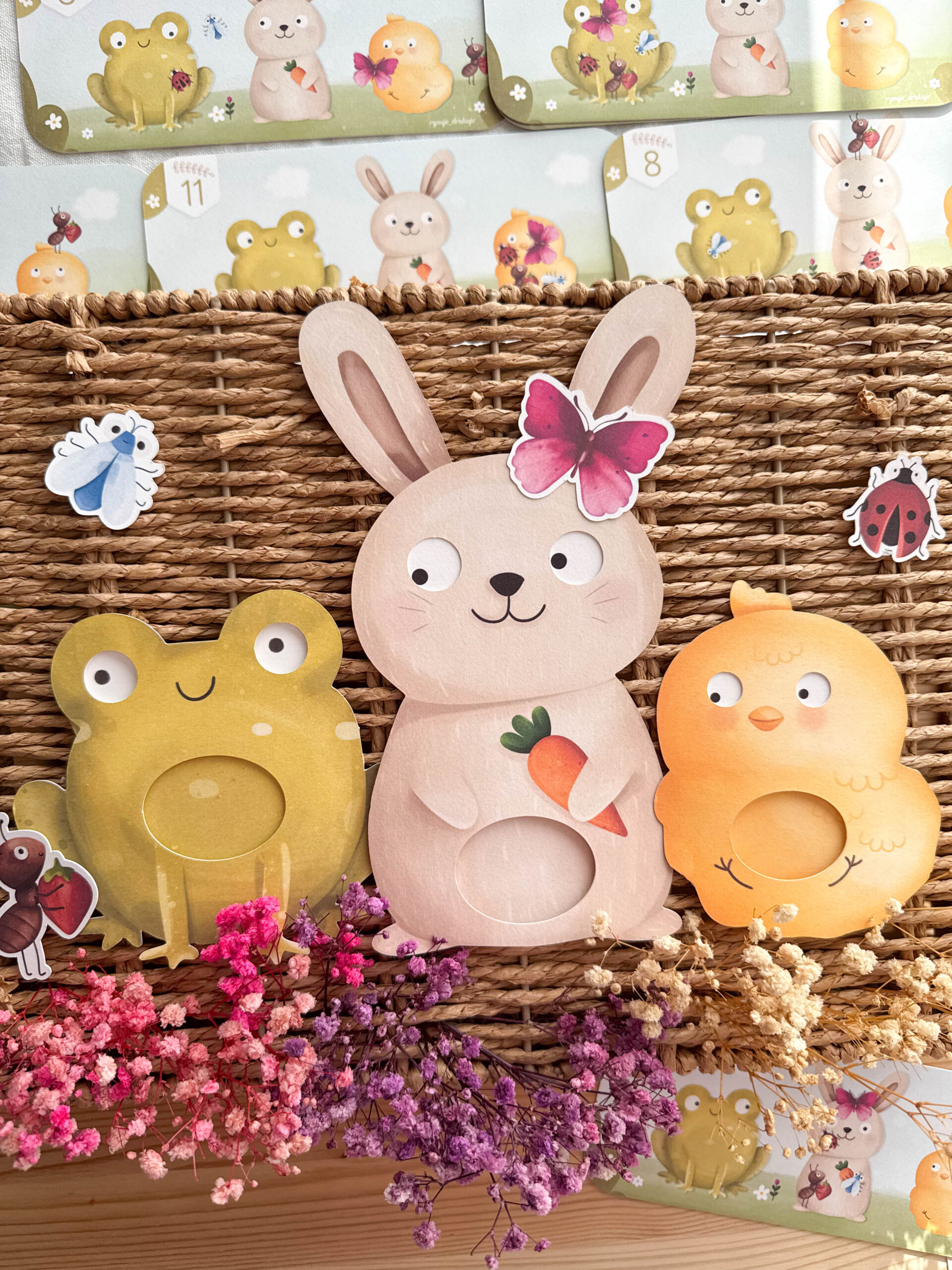 Na kartach czekają też mali bohaterowie – Mrówka 🐜, Motylek 🦋 i Biedronka 🐞. Czasem są blisko, a czasem trochę dalej. Zadaniem dziecka jest ustawić oczka zwierzątka i sprawdzić, na co patrzy… albo zgadnąć, co właśnie wypatrzyło.