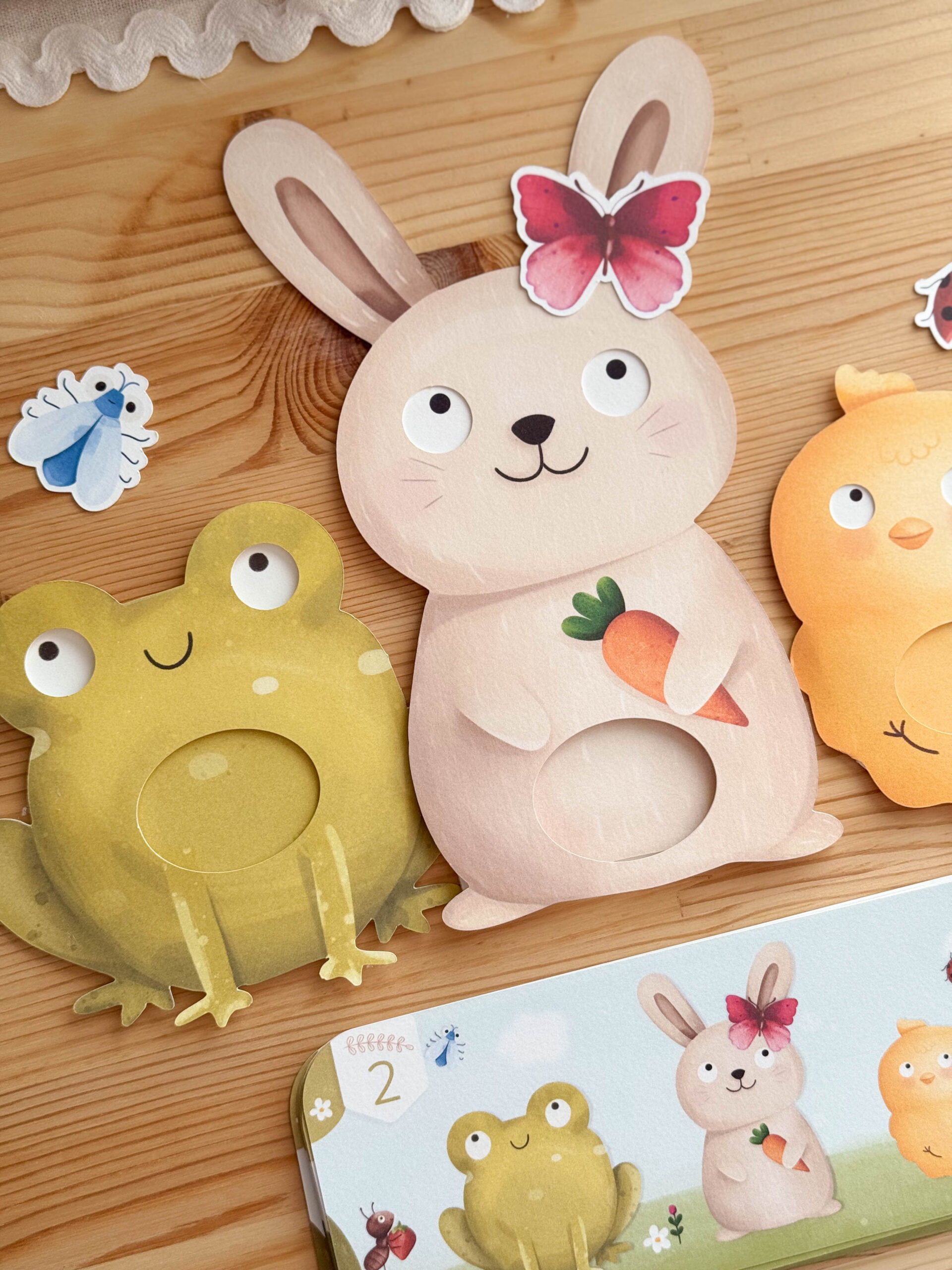 Zajączek, Żabka i Kurczaczek mogą patrzeć w dowolną stronę, a zadaniem dziecka jest odgadnąć, co właśnie wypatrzyły lub samodzielnie pokierować ich spojrzeniem. Na kartach czekają Mrówka, Biedronka i Motylek, które można odnajdywać i obserwować.