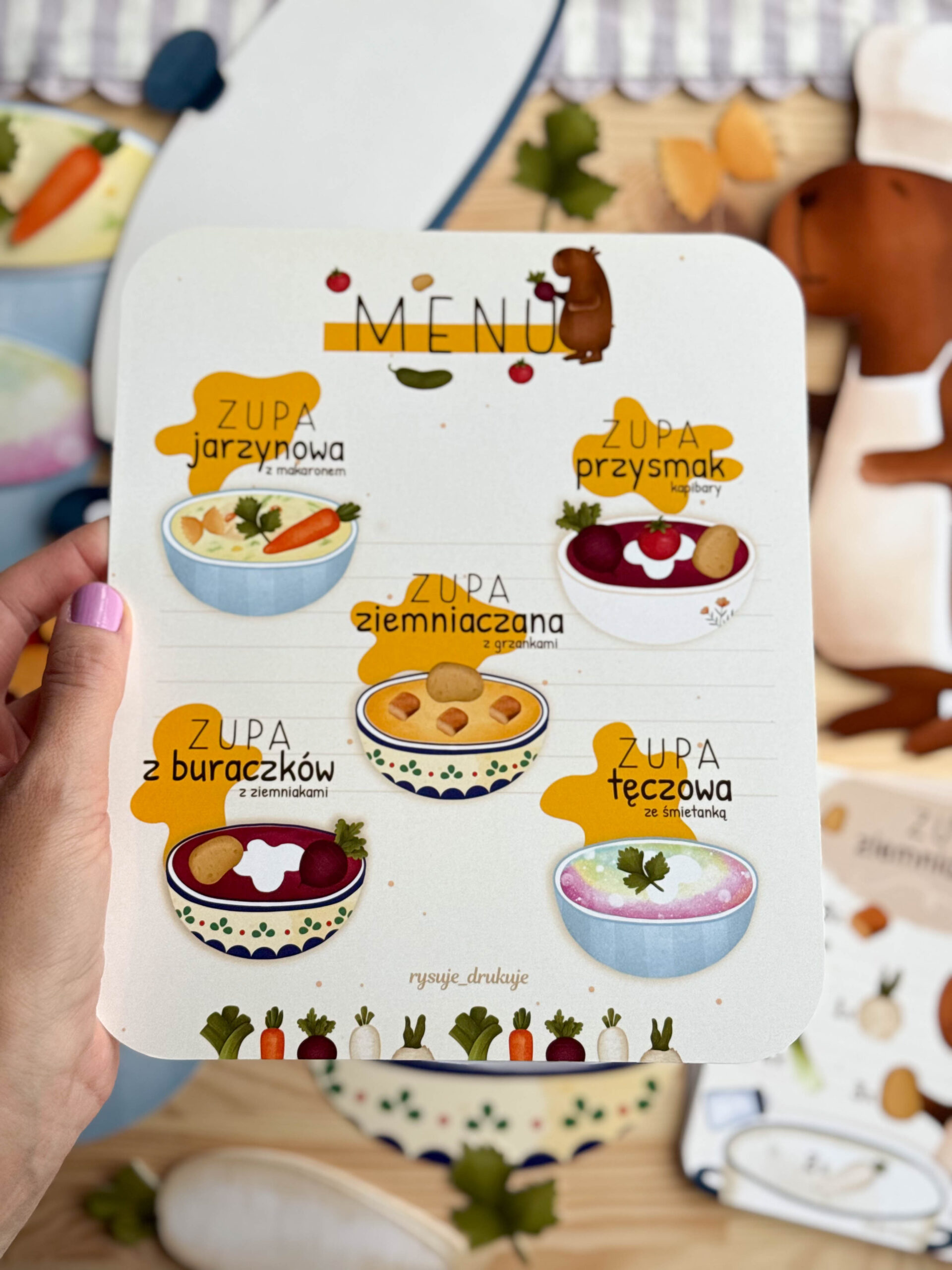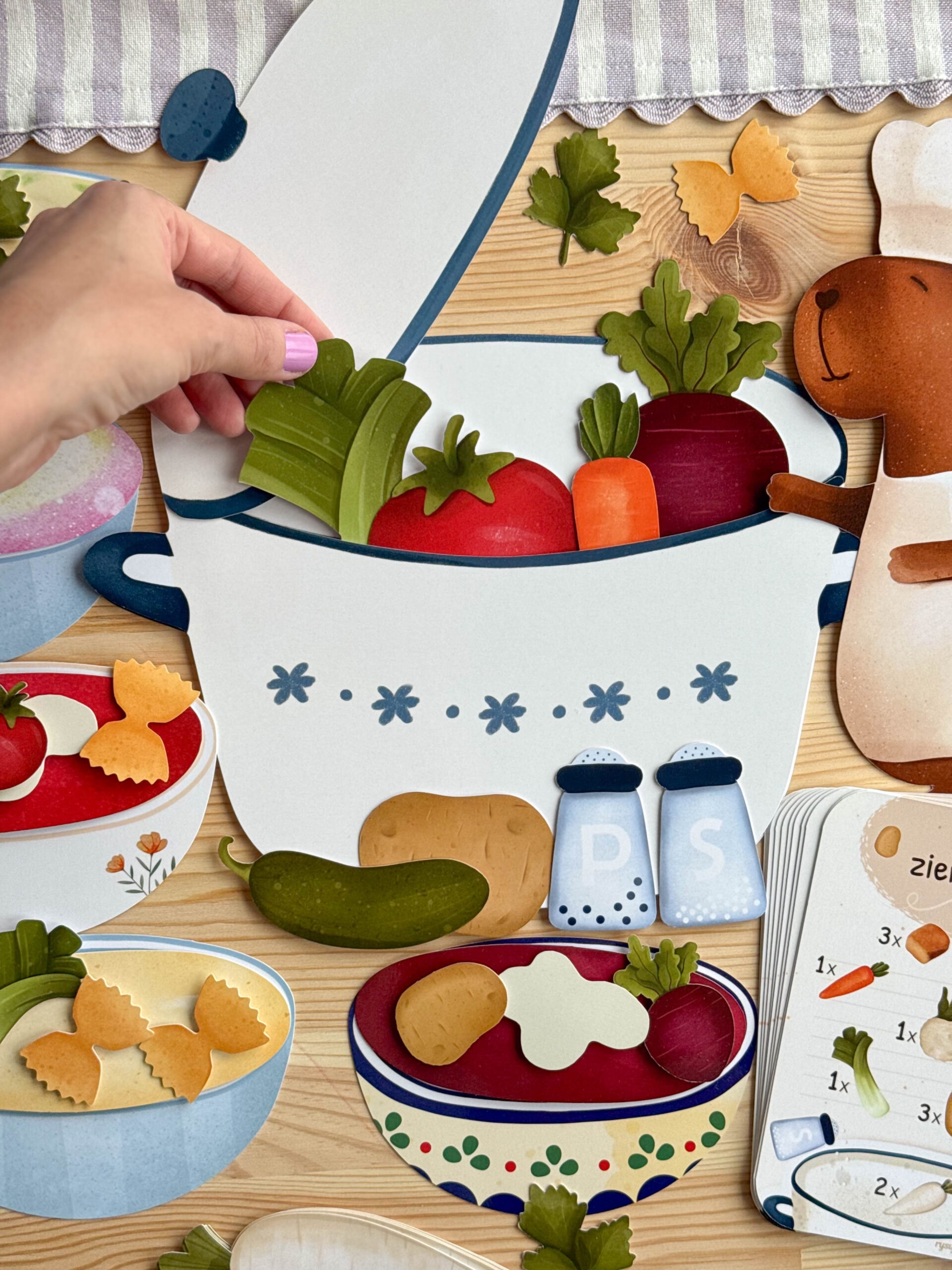 Mały kucharz wybiera zupę z karty menu, sprawdza przepis i przygotowuje składniki, następnie wkłada je do garnka. Na koniec układa zupę w miseczce – dokładnie tak jak w restauracji!