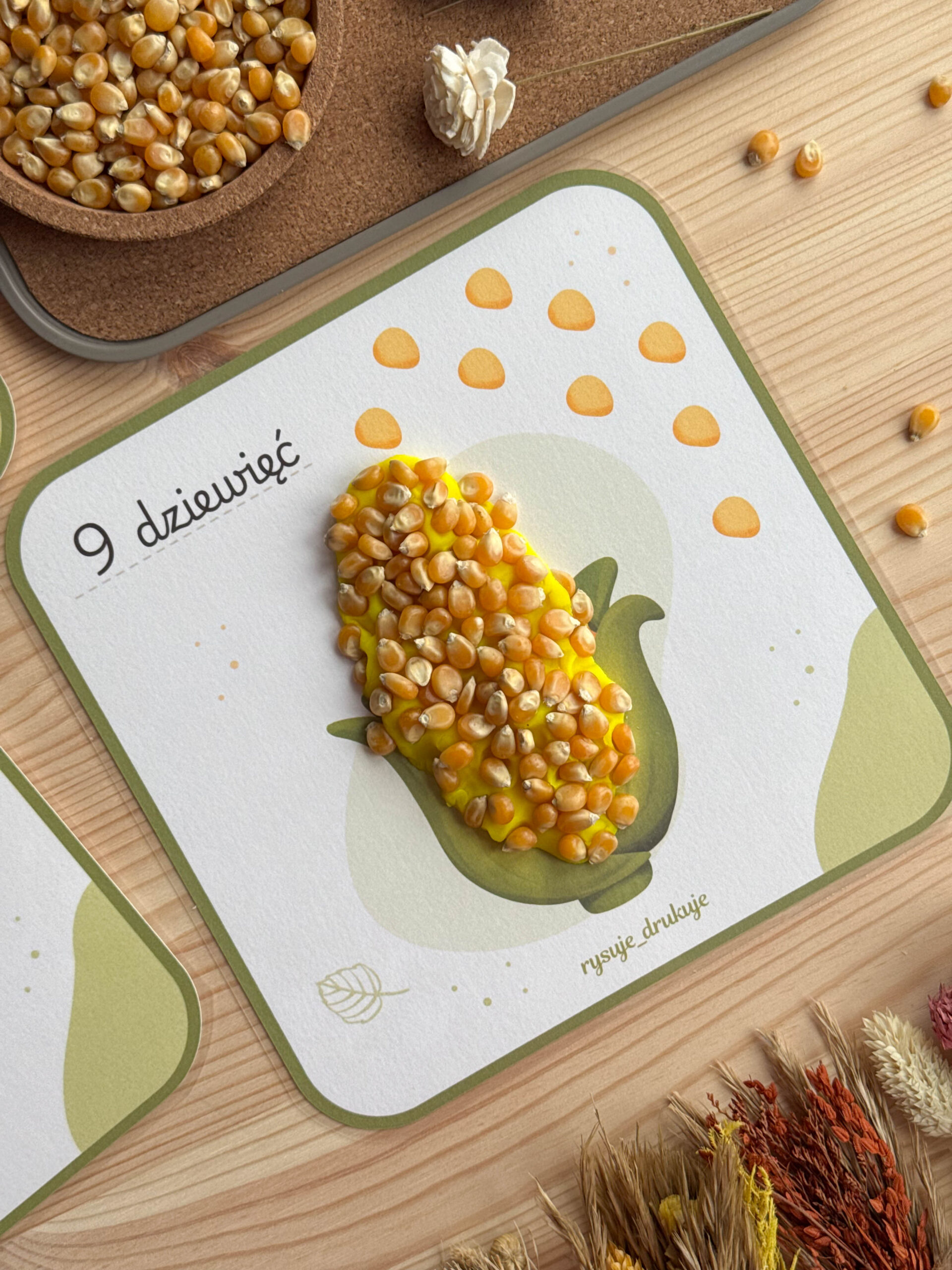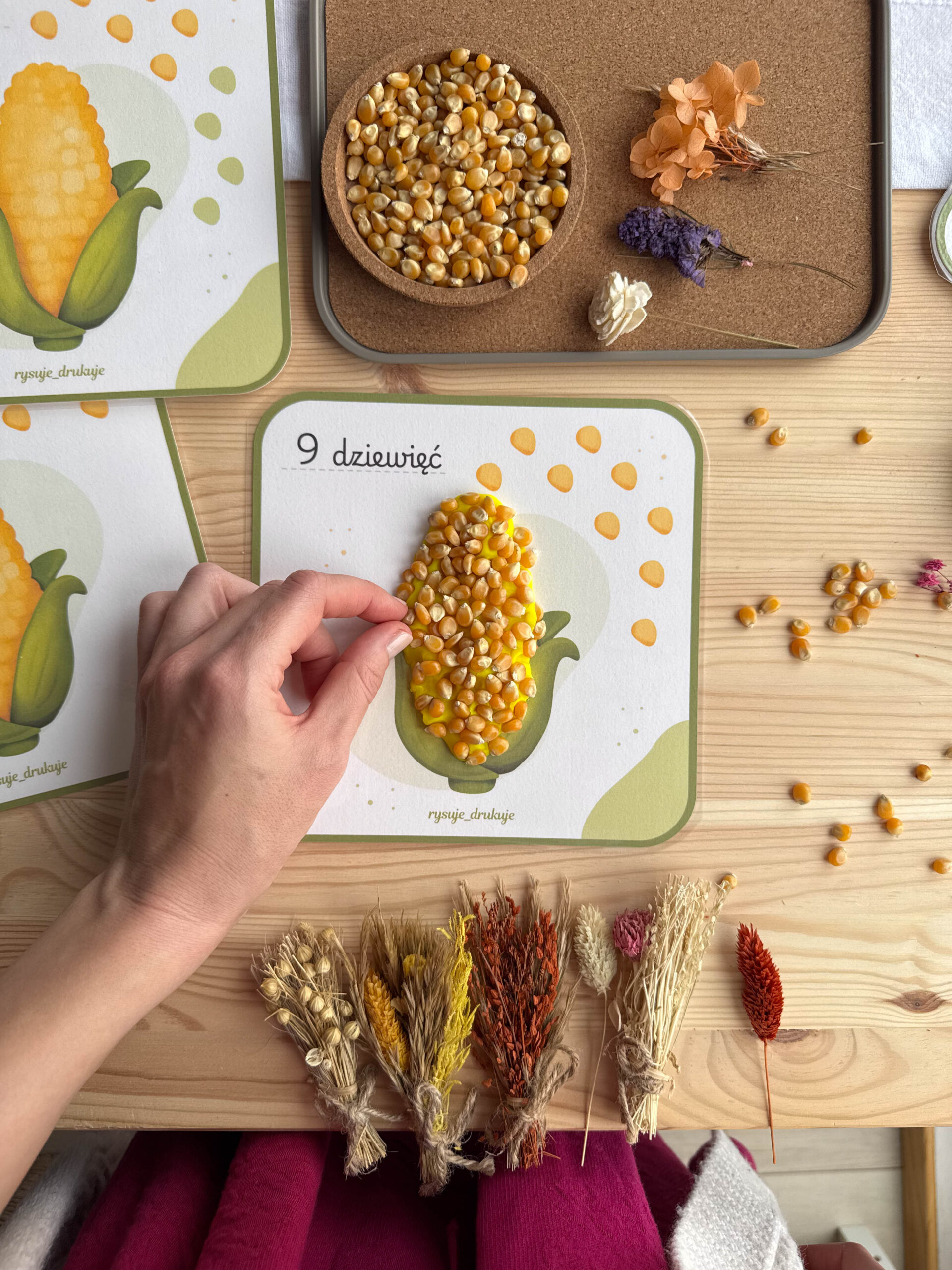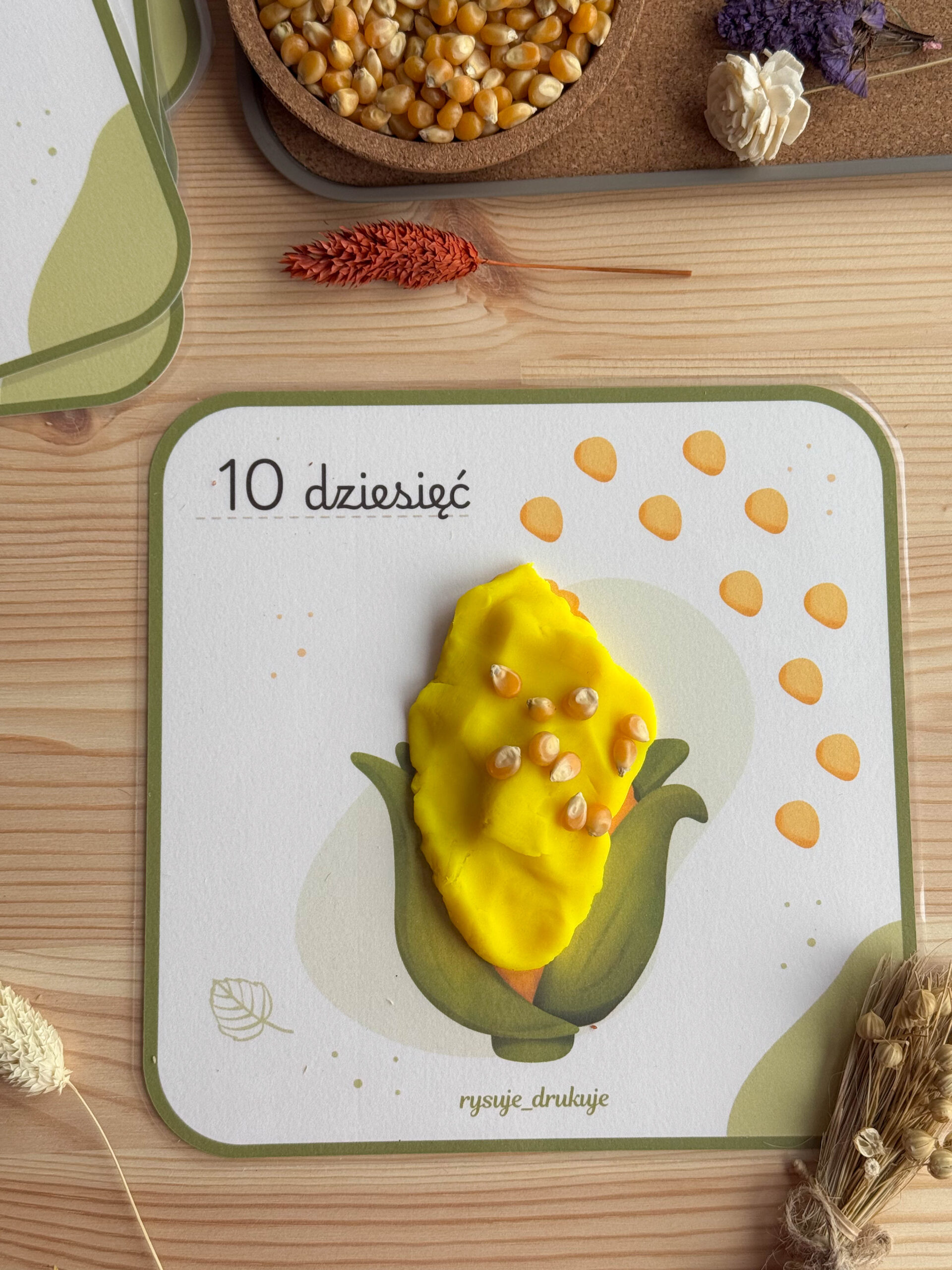 Dzięki kartom z kukurydzą maluchy tworzą własną kukurydzę z ciastoliny i doklejają tyle ziarenek, ile pokazuje karta. To idealne połączenie zabawy sensorycznej z pierwszą matematyką.
