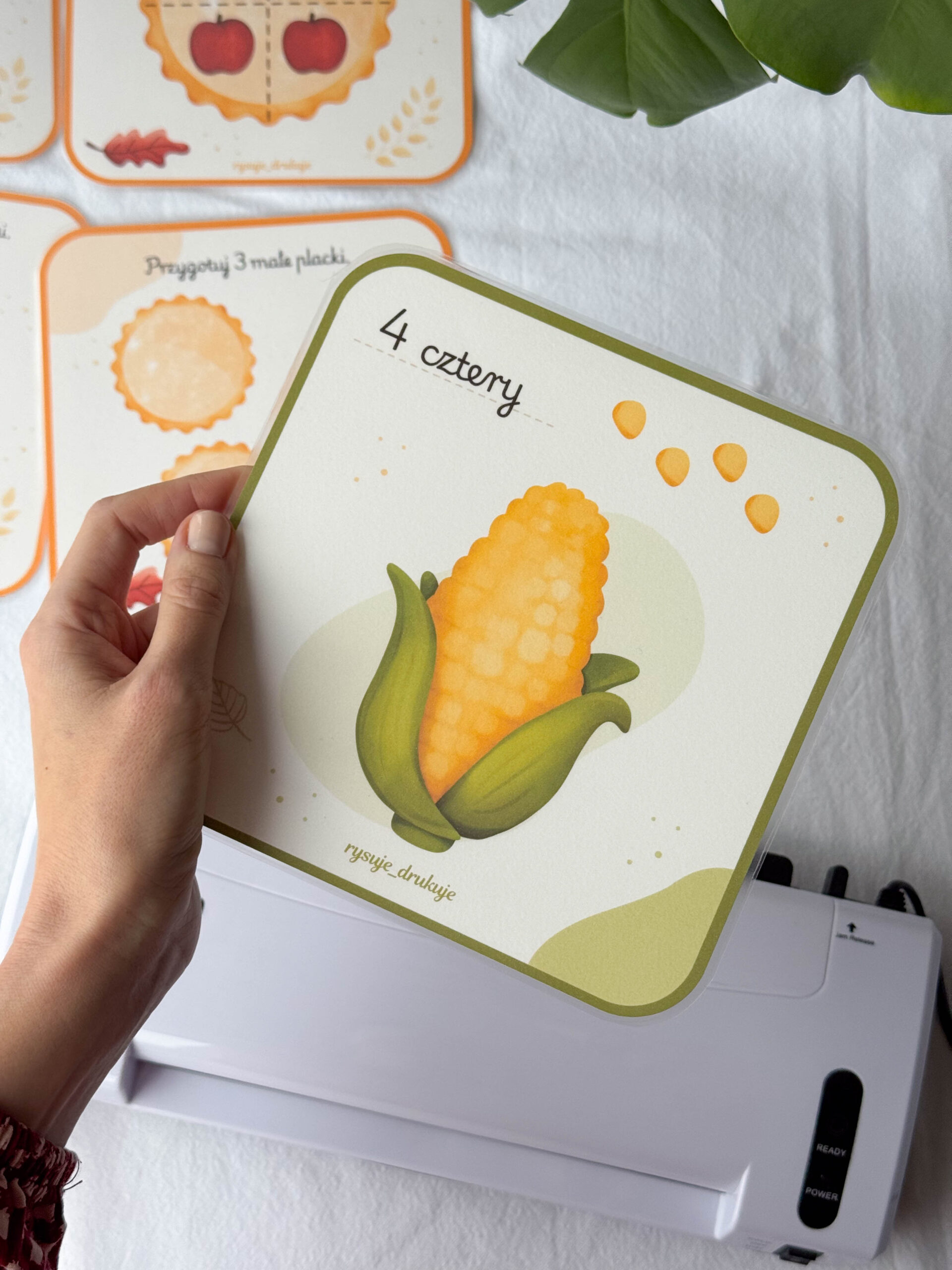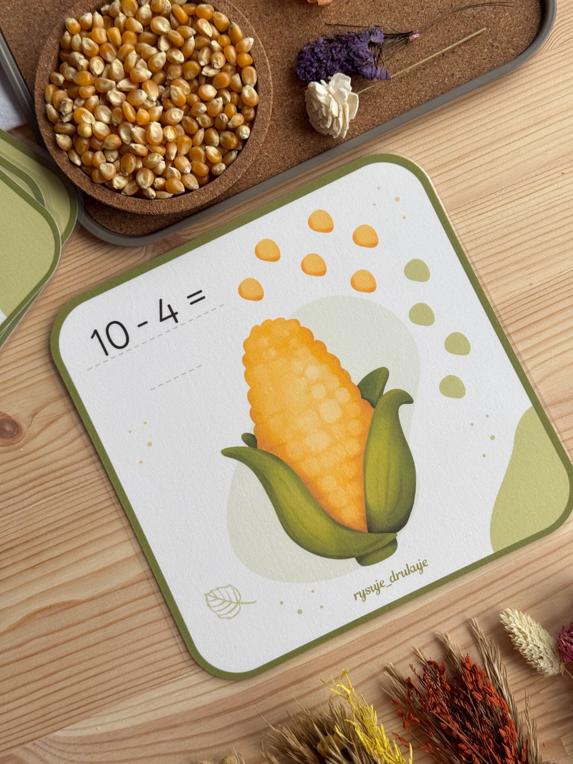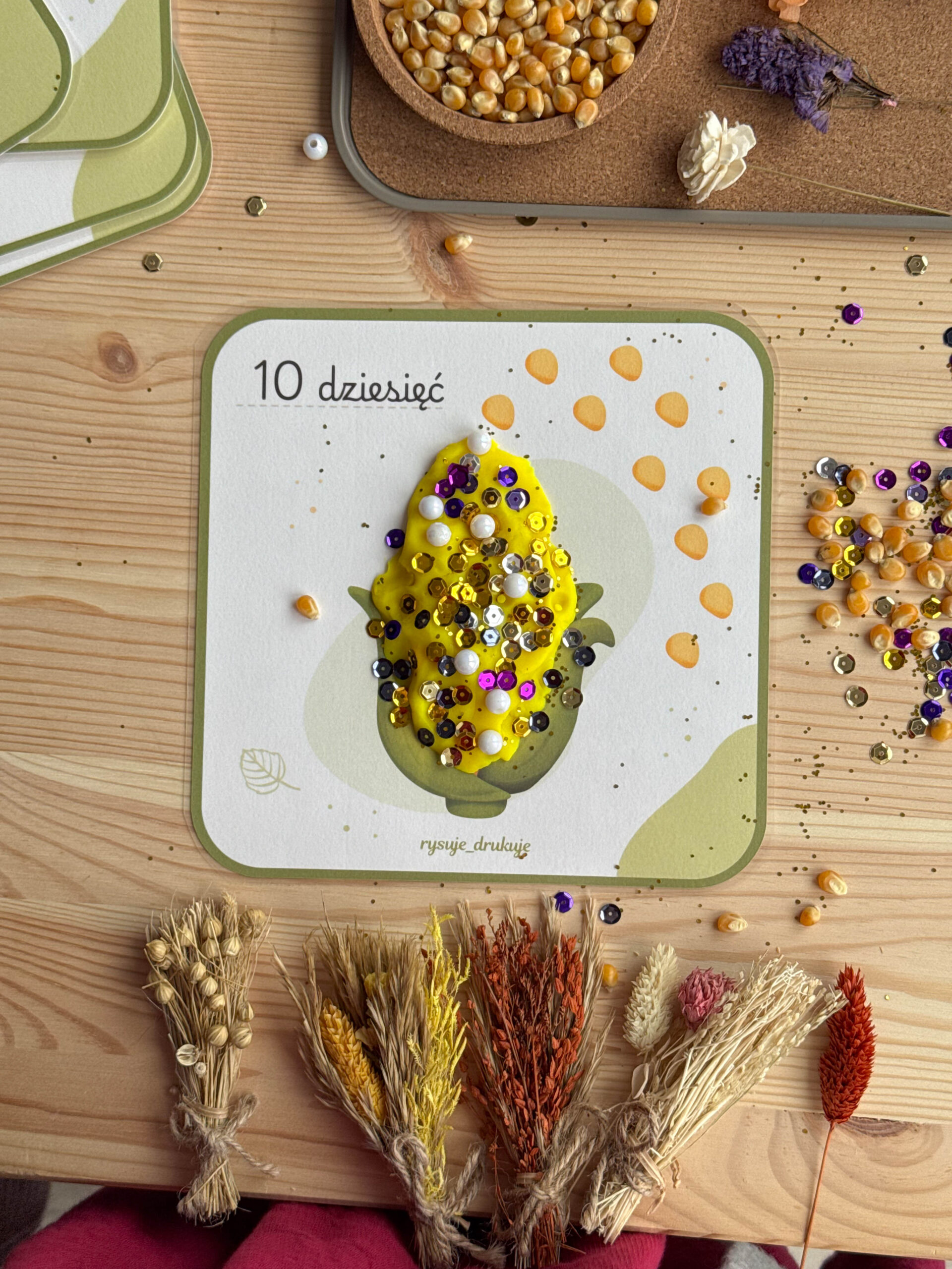 Dzięki kartom z kukurydzą maluchy tworzą własną kukurydzę z ciastoliny i doklejają tyle ziarenek, ile pokazuje karta. To idealne połączenie zabawy sensorycznej z pierwszą matematyką.