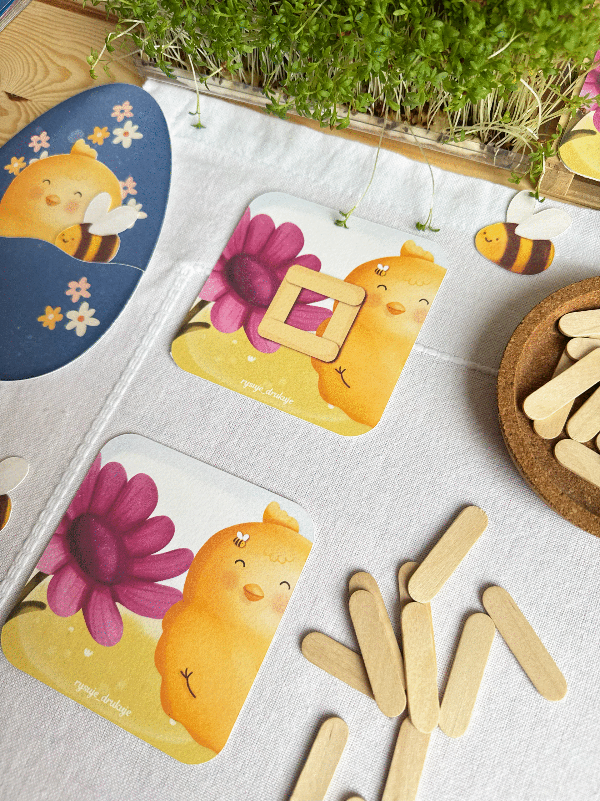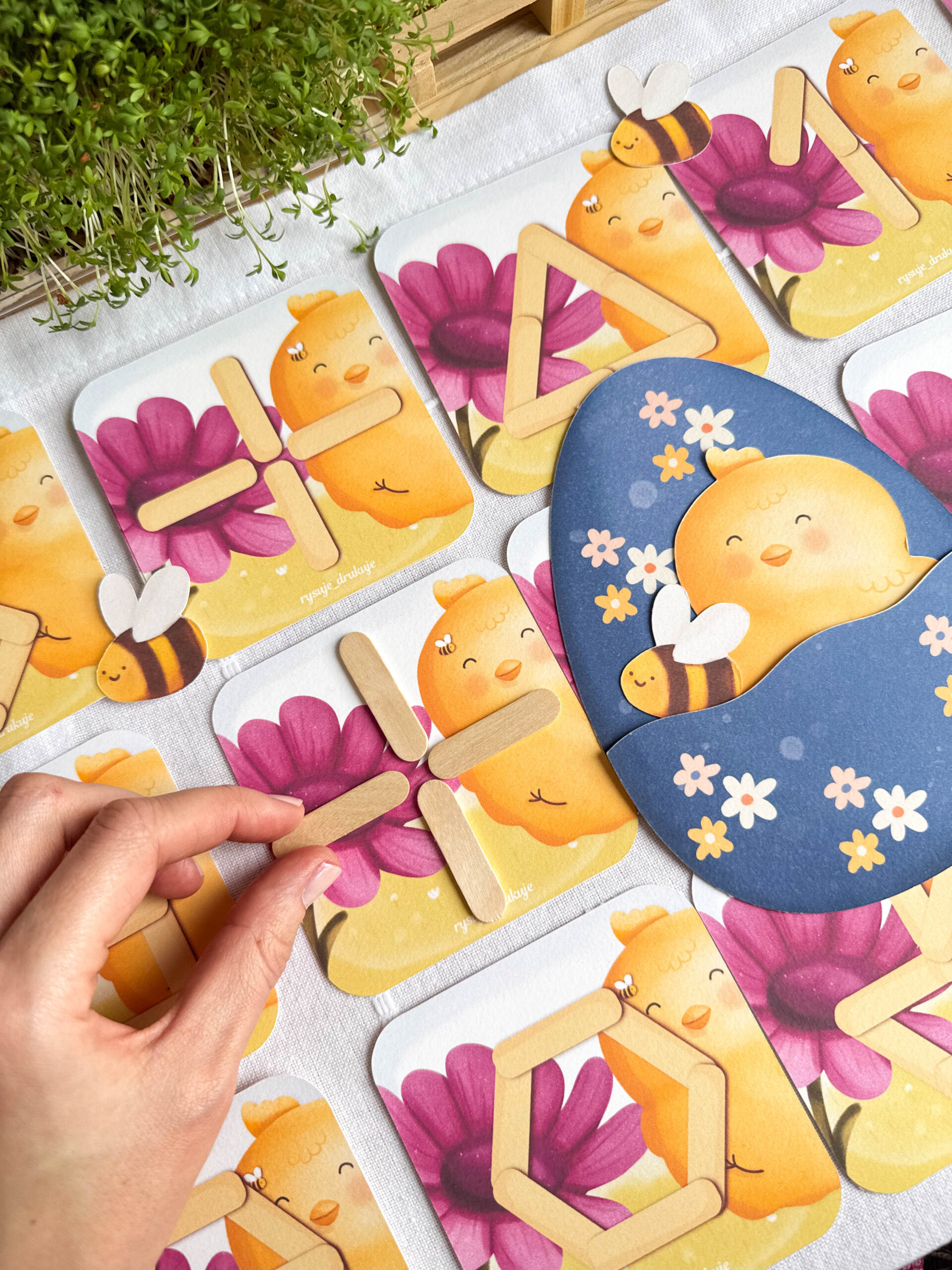 Kurczak i Pszczółka to zestaw kart do układania wzorów z patyczków.