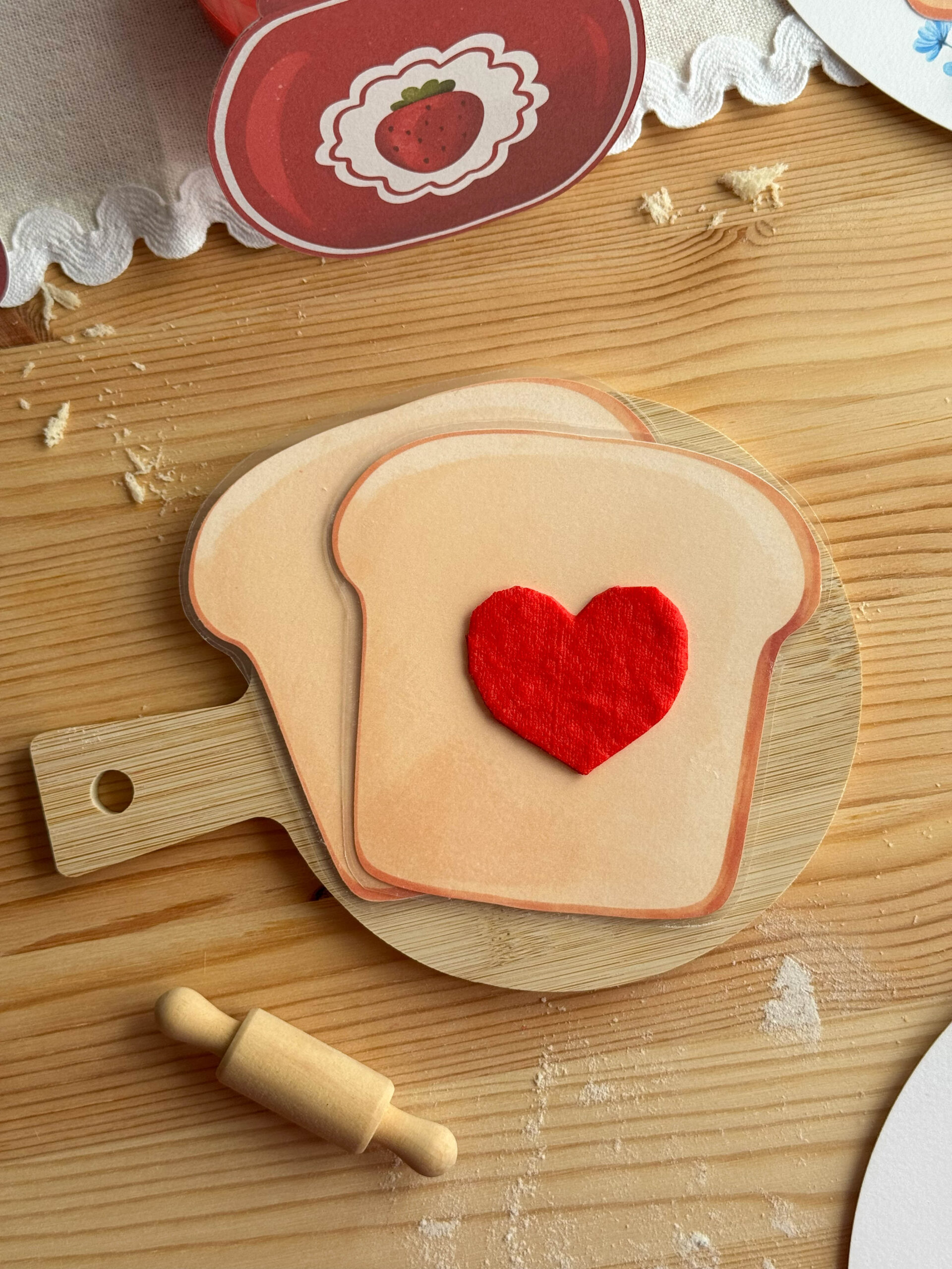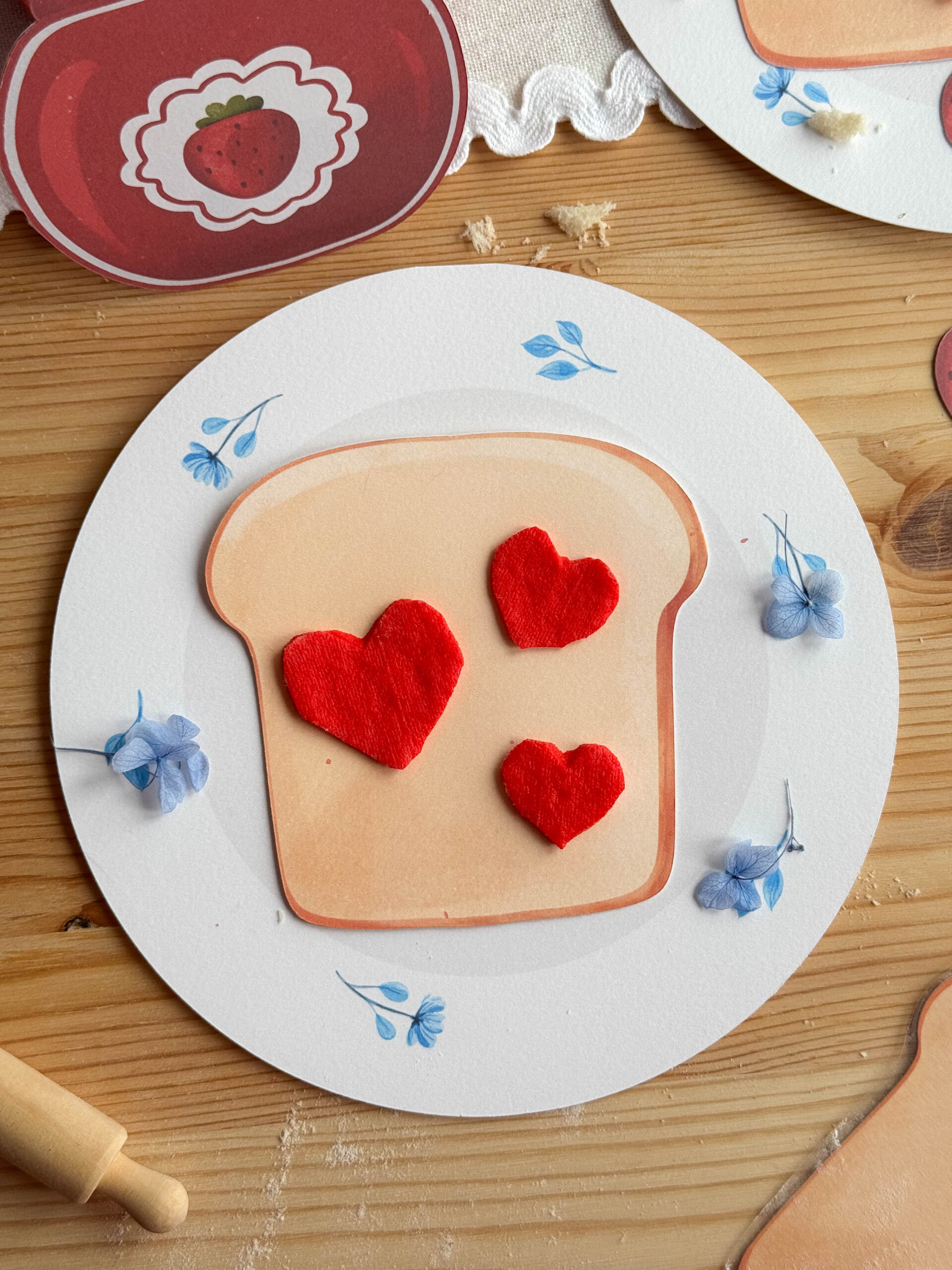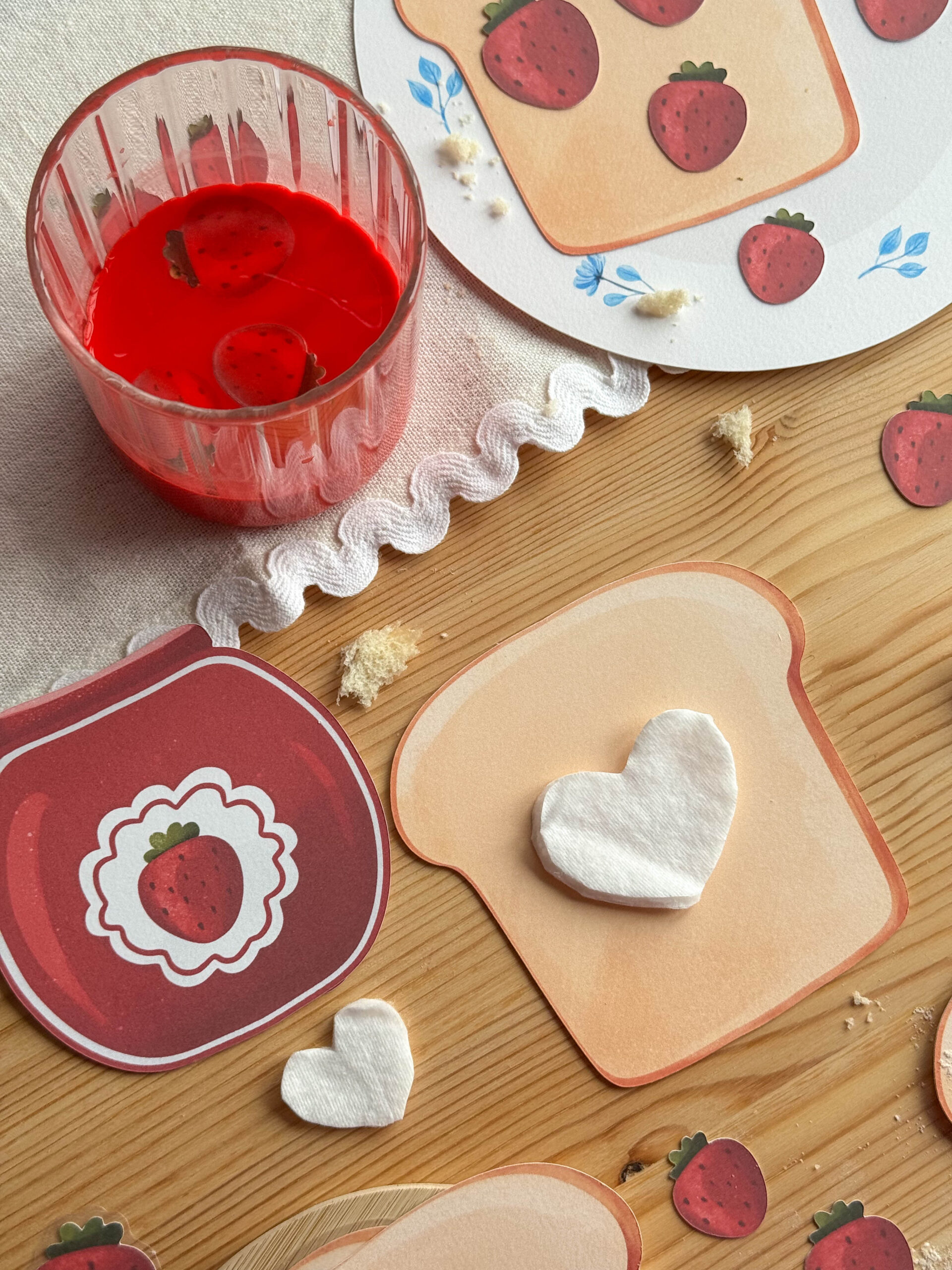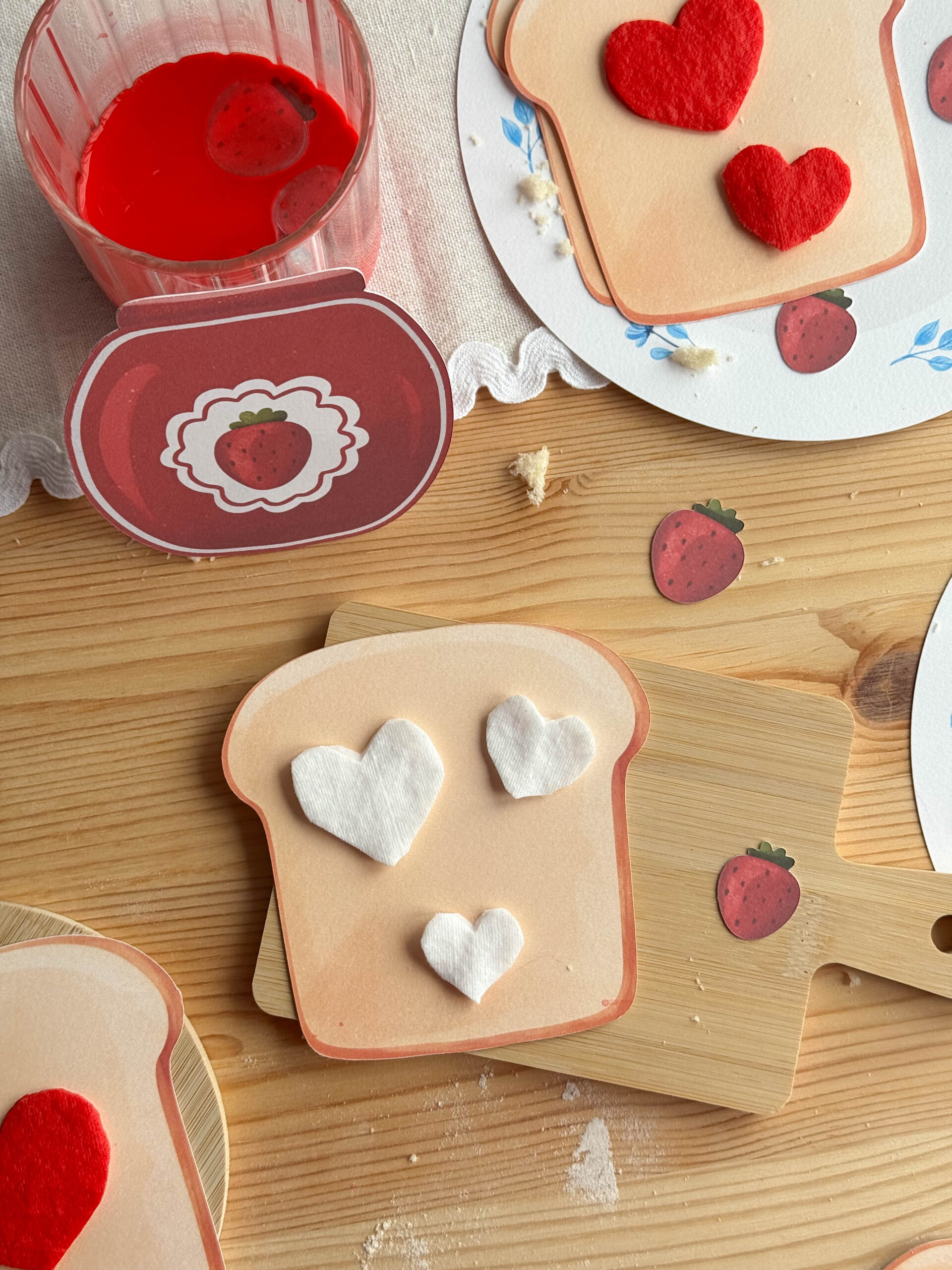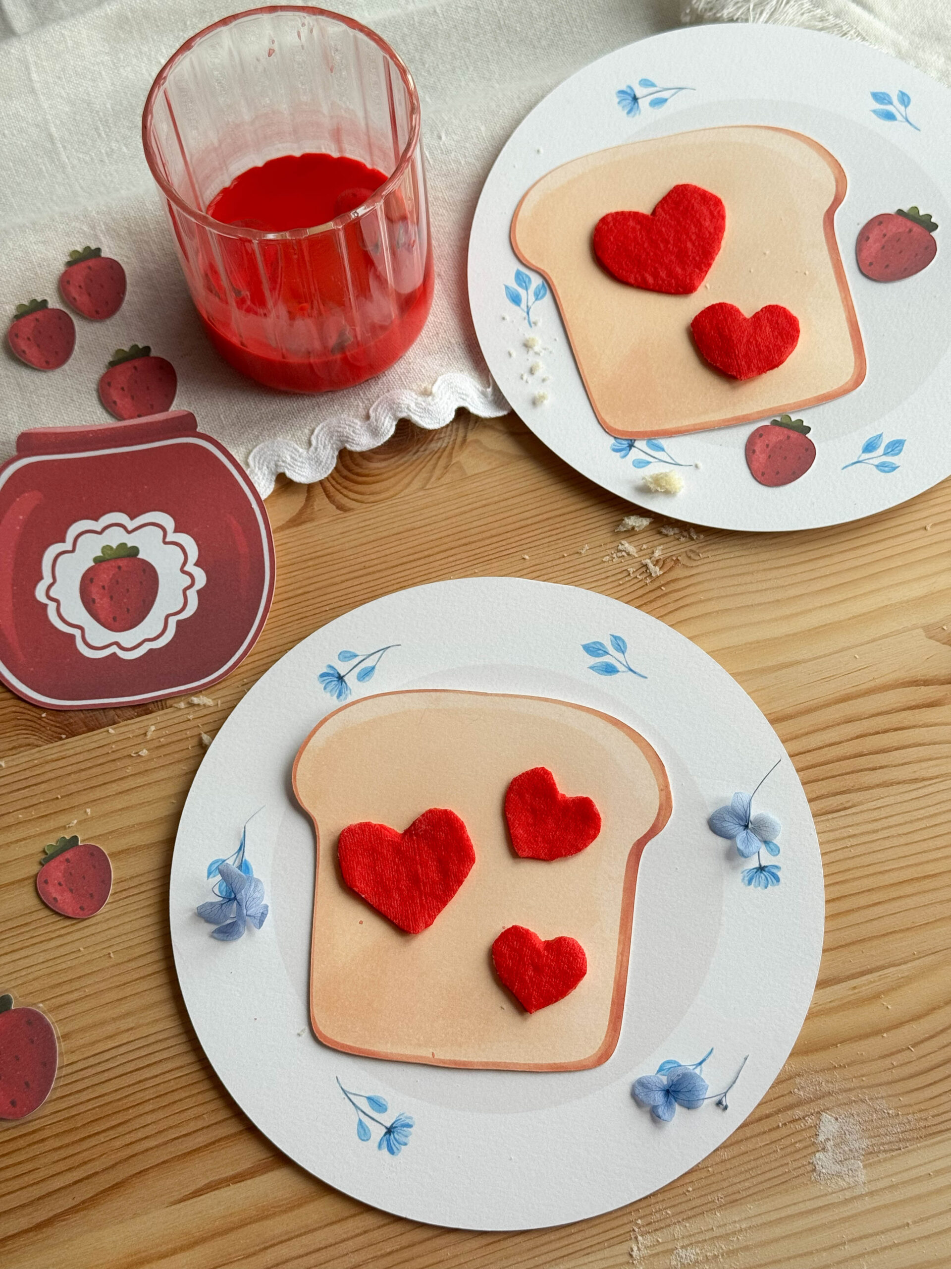 Serduszkowe płatki układamy na tostach i polewamy czerwoną farbą, tworząc apetyczny efekt truskawkowego dżemu.